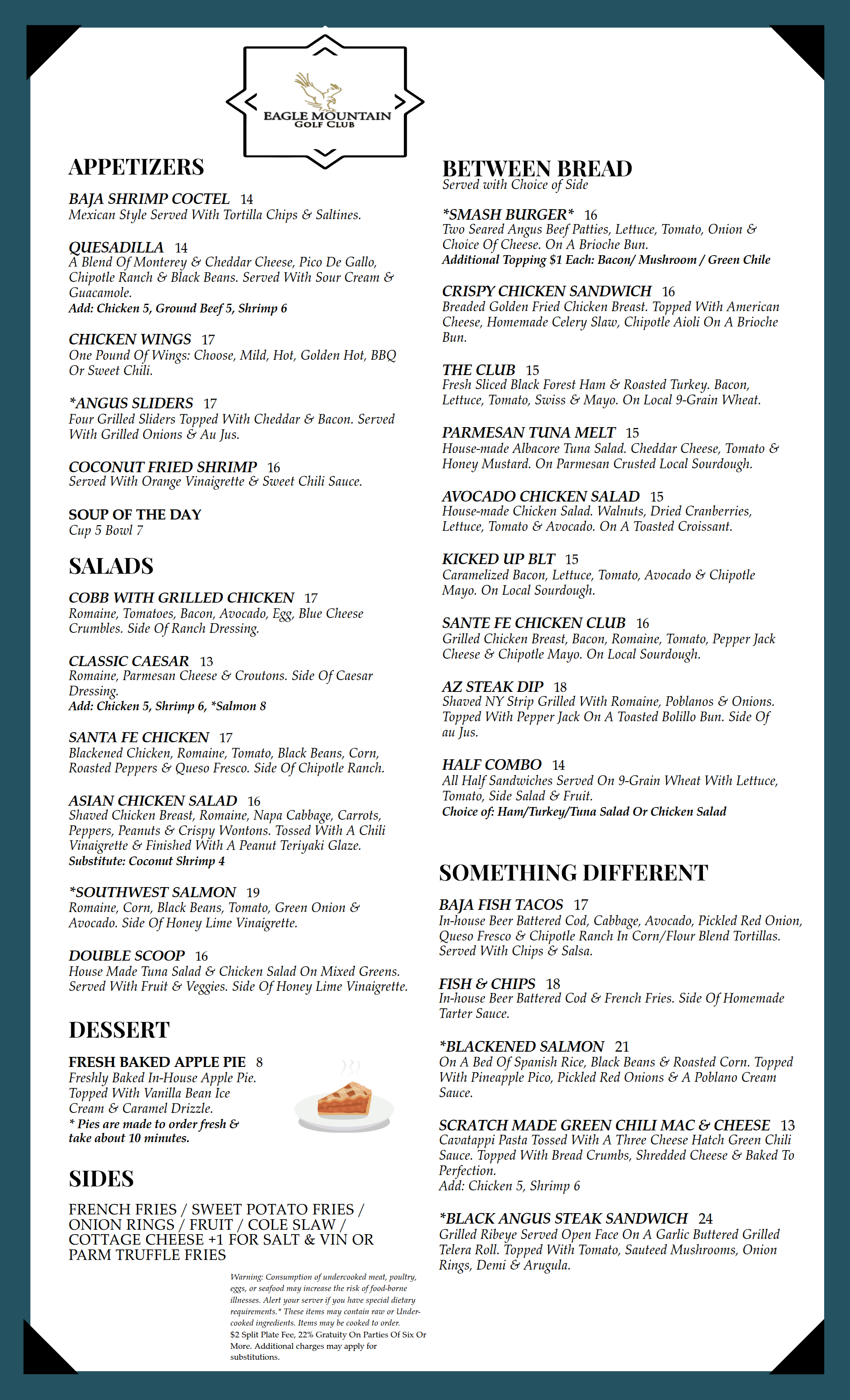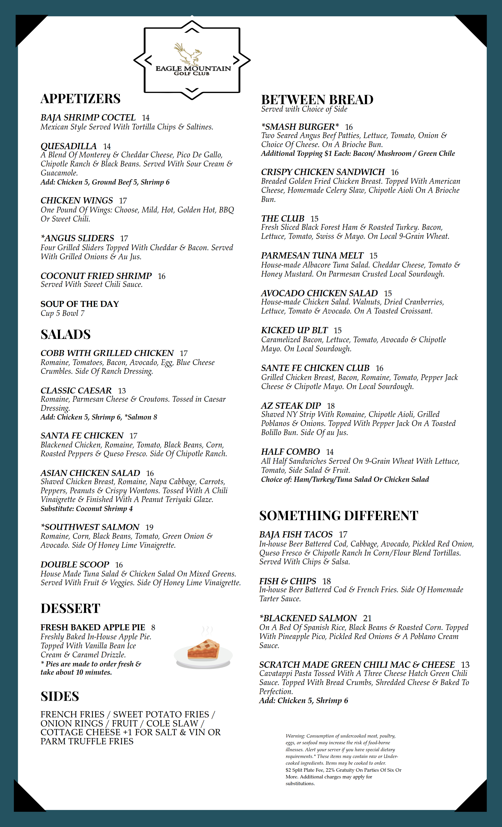 Warning: Consumption of undercooked meat, poultry, eggs, or seafood may increase the risk of food-borne illnesses. Alert your server if you have special dietary requirements.* These items may contain raw or Undercooked ingredients. Items may be cooked to order. $2 Split Plate Fee, 22% Gratuity On Parties Of Six Or More. Additional charges may apply for